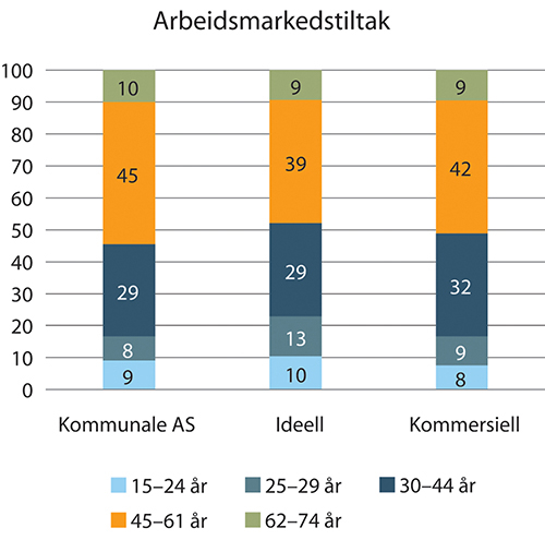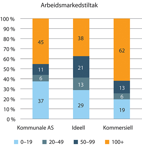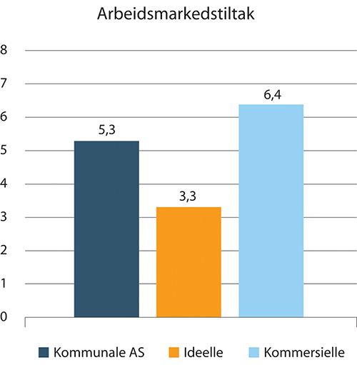 Det er svært få arbeidsmarkedstiltak som er drevet innenfor vanlig kommunal/statlig egenregi men mange er aksjeselskaper med kommunal aksjemajoritet. Disse kommunale aksjeselskapene er i hovedsak leverandører som er forhåndsgodkjent til å levere tiltakene varig tilrettelagt arbeid og arbeidsforberedende trening og mottar dermed tilskudd. De forhåndsgodkjente virksomhetene kan imidlertid også delta i anbudskonkurranser for tiltakene opplæring (AMO-kurs), avklaring, oppfølging og arbeidsrettet rehabilitering på linje med andre aktører. Overfor forhåndsgodkjente virksomheter stilles det bl.a. krav om at overskudd skal forbli i virksomheten og at det skal ikke utbetales utbytte. Hvorvidt en virksomhet er ideell eller ikke er avhengig av hvordan begrepet defineres. Basert på registrert sektorkode i Brønnøysundregistrene anses virksomheter som er registrert som kommunale eller statlige aksjeselskap ikke som ideelle organisasjoner. De ideelle er derfor i denne sammenheng en liten gruppe.
