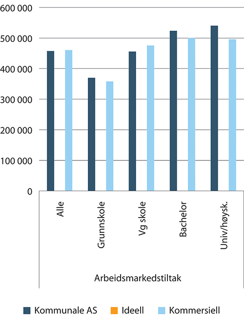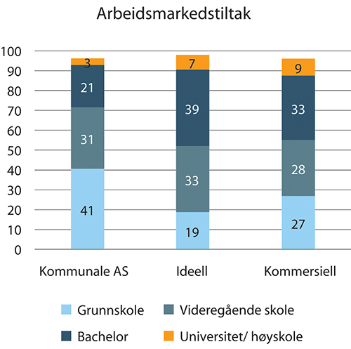 Nedenfor i figur 1.38 vises fordelingen av antall arbeidsforhold etter utdanning innen arbeidsmarkedstiltak. Et gjennomgående trekk er at det er færre som har bachelor eller master innen kommunale AS enn blant ideelle og kommersielle. Det er også flere i de kommunale AS’ ene som har kun grunnskoleutdanning (rundt 40 prosent). Andre kompetansekrav for tiltak som er forbeholdt forhåndsgodkjente leverandører enn anbudsbaserte tiltak hvor kommersielle aktører deltar, kan være en mulig forklaringsfaktor. For eksempel krever målgruppen i tiltaket varig tilrettelagt arbeid (VTA) en annen type kompetanse enn den kompetanse som kreves i andre arbeidsmarkedstiltak.28