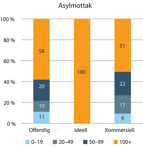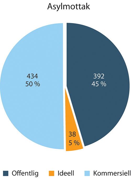 Samlet er det litt under 1 000 arbeidsforhold innen asylmottak. Halvparten av disse arbeidsforholdene er i kommersielle virksomheter, 45 prosent er i offentlige virksomheter, mens ideelle virksomheter har 5 prosent jf. figur 1.43.