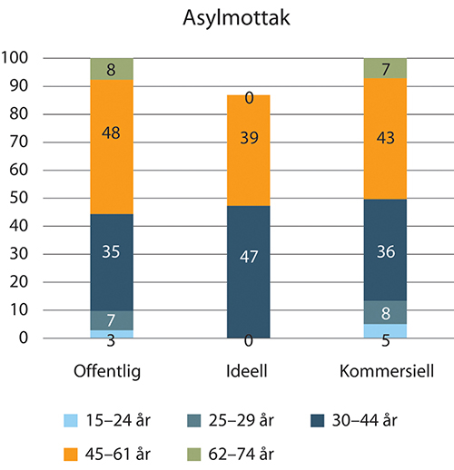 Aldersfordelingen innen asylmottak er omtrent lik for alle tre grupper hvor rundt halvparten er over 44 år.