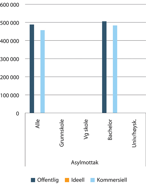 Nedenfor i figur 1.46 vises lønn per årsverk og etter utdanningsnivå for de grupper det finnes representative data for innen asylmottak.