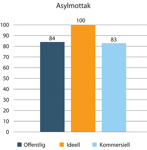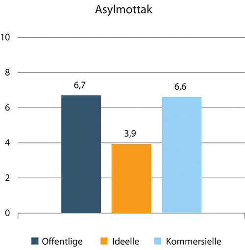 Sykefraværet i asylmottak varierer fra 3,9 prosent til 6,7 prosent. Ideelle asylmottak har lavest med 3,9 prosent, mens kommersielle og offentlige har omtrent likt med hhv 6,6 prosent for kommersielle og 6,7 prosent for offentlige.