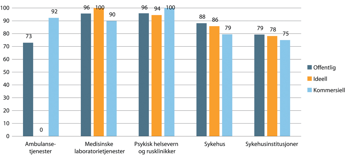 For psykisk helsevern og rusklinikker er litt over 90 prosent offentlige, mens 9 prosent er ideelle. For medisinske laboratorietjenester er nesten 90 prosent offentlige, mens 11 prosent er kommersielle. For ambulansetjenester er andelen offentlige ansatte litt over 90 prosent, mens 9 prosent er kommersielle.