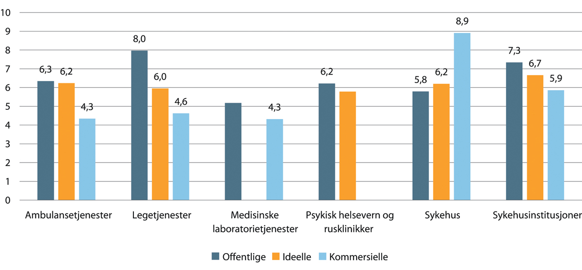 Oppsummert er omfanget av kommersielle målt i antall arbeidsforhold størst i legetjenester (93 %), etterfulgt av medisinske laboratorietjenester (11 %), og minst i sykehus (1 %). Omfanget av ideelle målt i antall arbeidsforhold er størst i sykehusinstitusjoner og sykehus, og er null eller liten (under 2 %) i de andre sektorene.