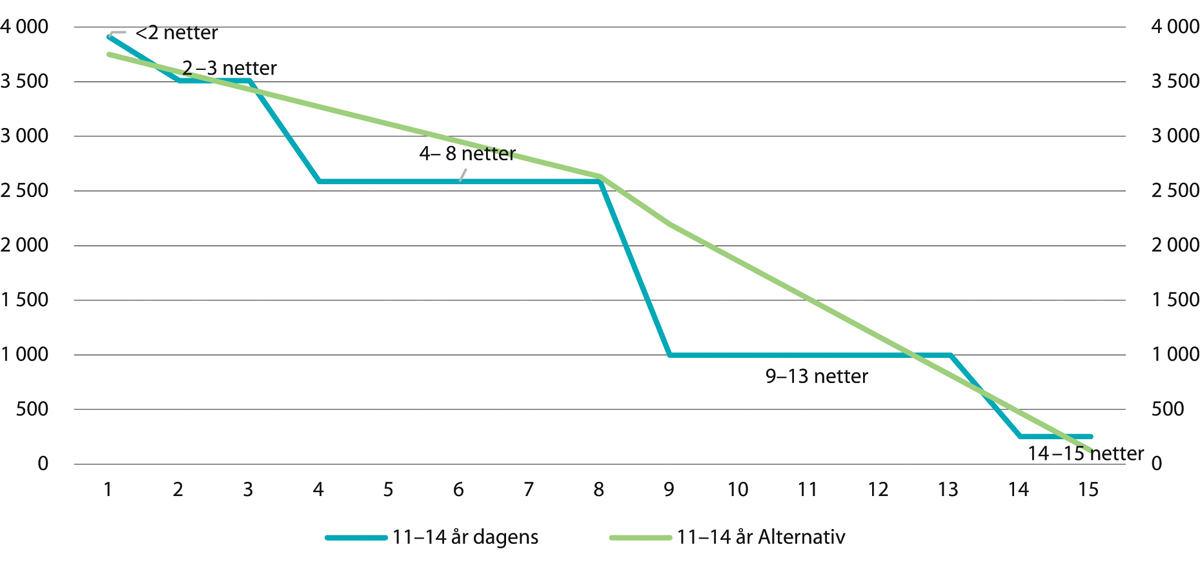 Figur 13.1 viser bidrag ved ulik grad av samvær for en 11–14-åring med dagens regler sammenlignet med om samværsfradraget var døgnbasert.20 Det er antatt at foreldrene har lik inntekt. Den blå linjen viser barnebidraget med dagens fire klasser for samværsfradraget. Den grønne linjen viser utvalgets forslag til alternativ beregning, som tar utgangspunkt i at samværsfradraget beregnes dag for dag, og ikke i klasser.