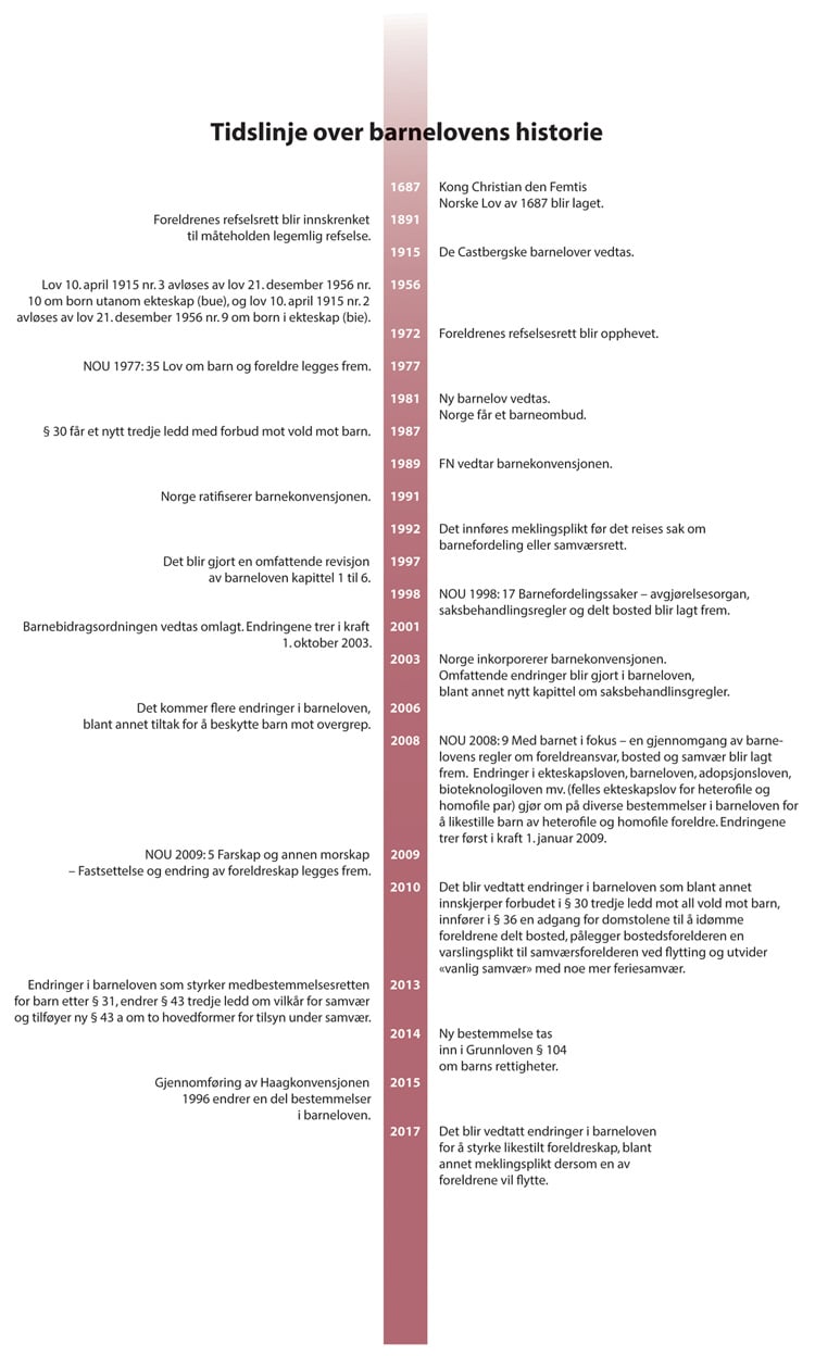 Norsk rett har i mange hundre år hatt regler på flere områder som i dag dekkes av barneloven. Reglene har underveis gjennomgått mange endringer i tråd med et skiftende samfunnssyn. I dette kapitlet trekker utvalget linjene tilbake til lovgivningen på 1600-tallet (kapittel 4.2) og forsøker å gi et omriss av de viktigste rettshistoriske begivenhetene i lovgivningen om foreldre og barn frem til i dag, se kapitlene 4.3 til 4.6. Kapitlet gir ingen uttømmende redegjørelse for rettshistorien på barnelovens område, men er tatt inn her for å gi en kontekst og være en bakgrunn for utvalgets arbeid når det nå skal lages en ny lov. Videre kan kapitlet også fungere som et oppslagsverk for lover og lovforarbeider når disse henvises til videre i andre deler av utredningen. I de ulike tematiske kapitlene vil utvalget enkelte steder gå nærmere inn på historien og endringer for å belyse særskilte problemstillinger. En tidslinje over utviklingen er inntatt som en figur sist i kapitlet.