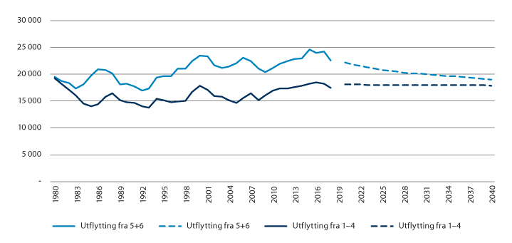 Figur 2.10 Antall utflyttinger fra sentralitet 5 og 6 til sentralitet 1–4 og fra sentralitet 1–4 til sentralitet 5 og 6. Faktiske tall 1980–2018 og beregnede tall 2020–20401
