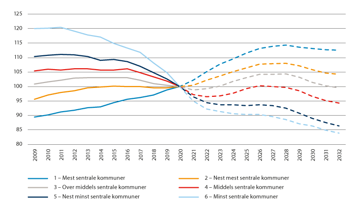 1 Antall personer 15–19 år er satt til 100 i 2020 for hvert sentralitetsnivå. Et tall på 120 viser at aldersgruppen var eller vil være 20 prosent større enn i 2020, mens et tall på 90 viser at aldersgruppen var eller vil være 10 prosent lavere.