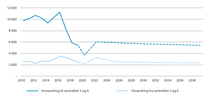 1 Flytting fra kommuner på sentralitet 5 og 6 til kommuner på sentralitet 1–4 og fra kommuner på sentralitet 1–4 til kommuner på sentralitet 5 og 6. Flytting mellom kommuner på sentralitet 5 og 6 er ikke tatt med.