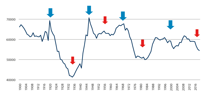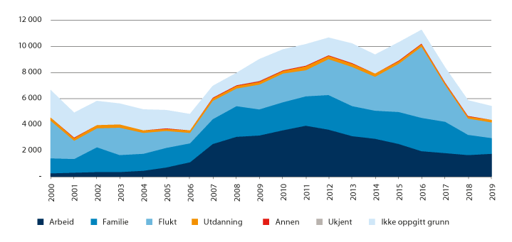Utflyttingen fra distriktene økte markant på 1990-tallet, både i antall og målt som høyere utflyttingsrater. Dette skyldes antakelig den sterke veksten i antall unge som søkte seg til høyere utdanning i denne perioden.16 På 2000-tallet har utflyttingen holdt seg på dette høye nivået, men med variasjoner over tid. Det siste tiåret var utflyttingen lavere i etterkant av finanskrisen i 2009 og har vært økende til relativt høye nivåer de siste fem årene.