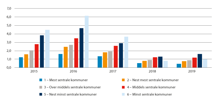 Grunnen til denne utviklingen er at antallet unge voksne er framskrevet å synke i distriktskommuner, men holde seg mer stabilt i mer sentrale kommuner. Dette kan vi illustrere ved å se på utviklingen i antall ungdommer mellom 15 og 19 år, jf. figur 2.11. De siste 10 årene har antallet sunket med 20 prosent på sentralitet 6 og 10 prosent på sentralitet 5. Denne brå nedgangen har skapt utfordringer for skolestrukturen i videregående opplæring.