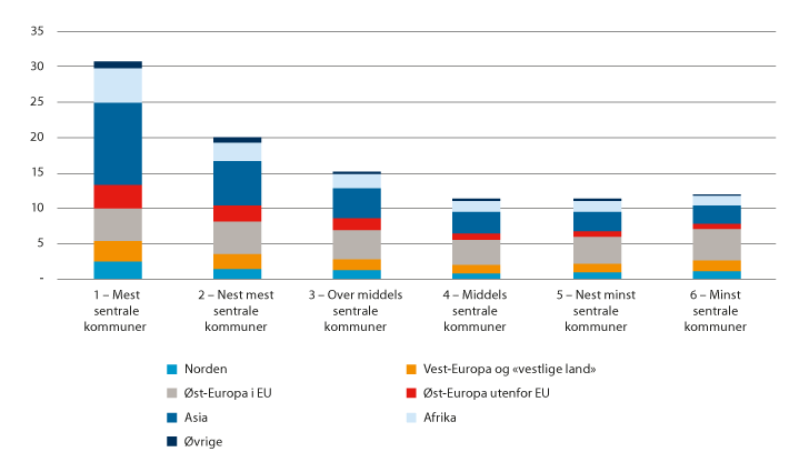Som vi så i boks 2.3, har en relativt stor andel av flyktningene blitt bosatt i distriktskommuner.