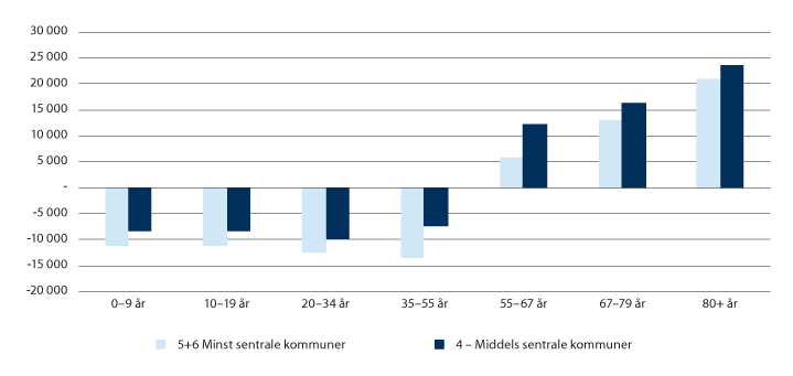 Hovedalternativet i de nye framskrivingene viser derimot en relativt stabil utvikling i folketallet i distriktskommuner på sentralitet 5 og 6.12 Framskrivingene viser, som forventet, en markant vekst i både antall eldre og andel eldre. Vi skal vise at nettopp aldringen i seg selv virker stabiliserende av to grunner: Færre unge gir lavere utflytting, og den kraftige veksten i antall eldre gir en større befolkning. Vi skal også se at distriktene er avhengig av tilflytting enten fra utlandet eller fra mer sentrale kommuner for å opprettholde folketallet på sikt. På tross av stabilitet i folketallet framover kan vi forvente en markant nedgang i antall unge og folk i yrkesaktiv alder i distriktene.