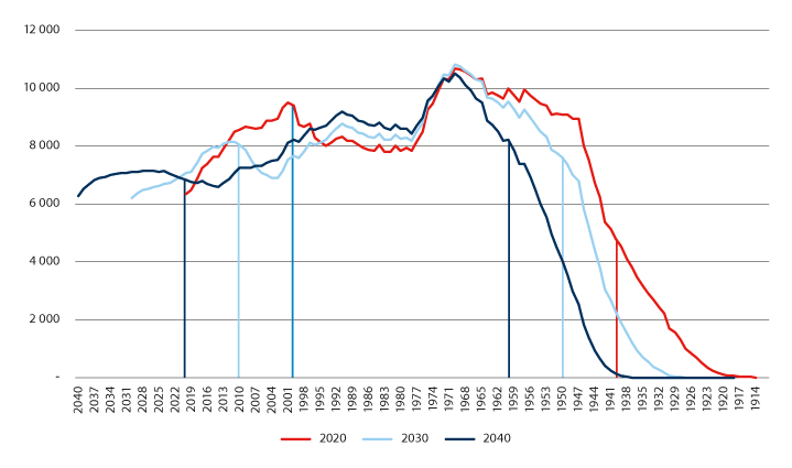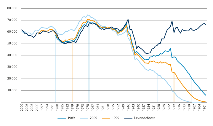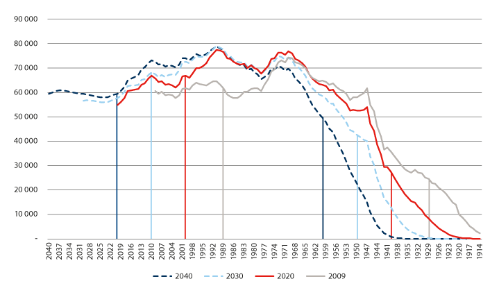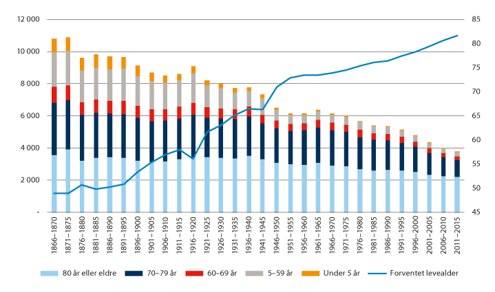 Endringer i forsørgerbyrden for eldre har inngått som en sentral del av det politiske utfordringsbildet etter hvert som befolkningsframskrivinger har vist at forholdstallet vil bli lavere. Dette har vært et sterkt argument for sentrale politiske tiltak og reformer, som for eksempel innretningen av pensjonssystemet.51 Bekymringene i forbindelse med aldrende befolkning har etter hvert flyttet seg fra pensjonssystemet til helsevesenet. Dette belyses også i utvalgets mandat, der det pekes på eldres behov for ulike offentlige tjenester og tilgjengelig arbeidskraft for å dekke dette behovet. Vi vil i kapittel 5 vise at det kommunale inntektssystemet i stor grad er innrettet mot å jevne ut forsørgerbyrden for eldre kommunene imellom. I kapittel 6 skal vi se at det kan være mer hensiktsmessig å bruke beregninger av faktisk behov for helse og omsorgstjenester, sammen med faktisk sysselsettingsandel i beregninger av tilgjengelig arbeidskraft, for å kunne danne seg et bilde av konsekvensene av den demografiske utviklingen.