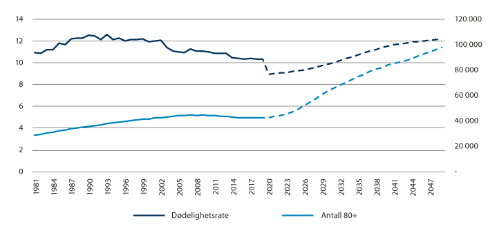 Distriktskommuner har i dag en eldre befolkning enn resten av landet. Fram til 2040 vil antallet personer over 80 år i distriktene nesten doble seg. Distriktskommuner får dermed en eldrebølge på toppen av en allerede relativt gammel befolkning. Veksten i antall 80-åringer er nesten like stor som fremskrevet nedgang i antall personer i yrkesaktiv alder. Økt antall eldre vil øke utgifts- og sysselsettingsbehovet til pleie- og omsorgssektoren. Færre personer i yrkesaktiv alder vil redusere tilgjengelige ressurser i form av skatteinntekter og arbeidskraft.
