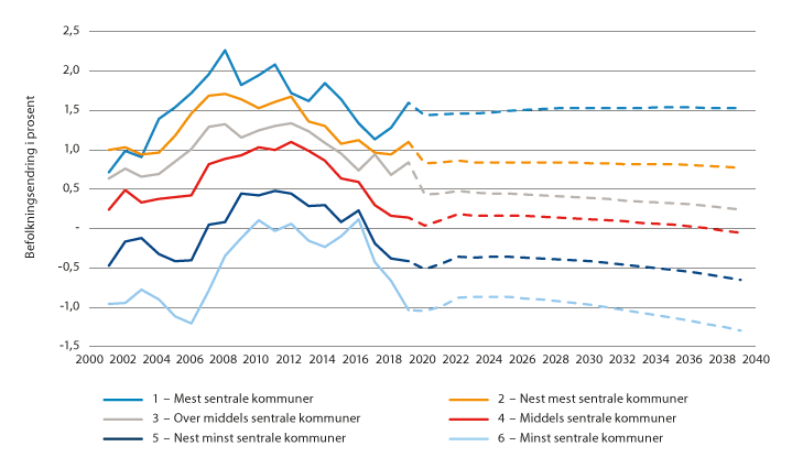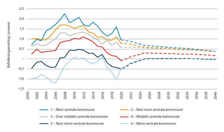 Figur 2.5 Endring i folketallet etter sentralitet. Faktisk utvikling 2000–2020 og SSBs framskrivinger 2020–2040. Tall i prosent