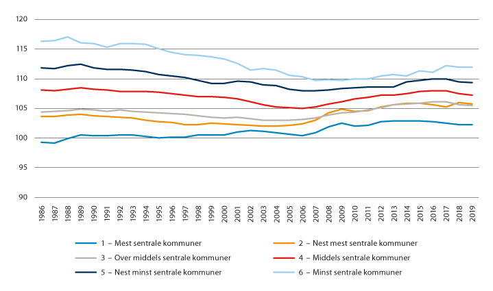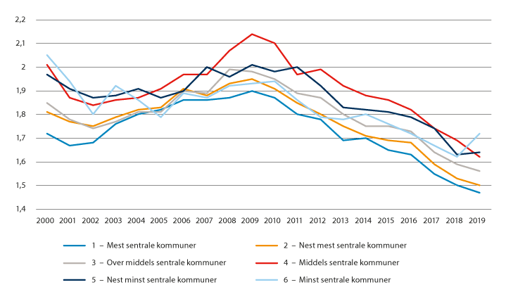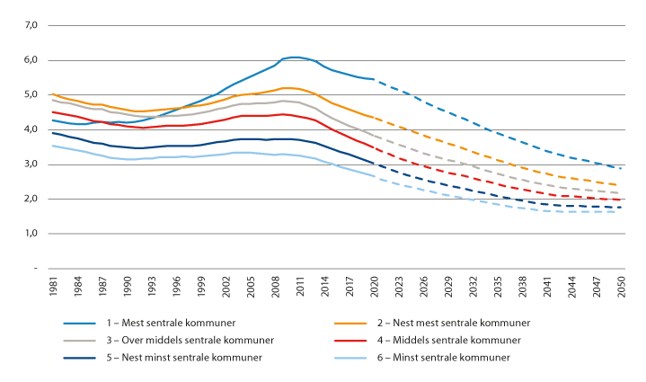 Figuren viser at forholdstallet var stabilt for sentralitetsnivå 6 (litt over 3) og 5 (litt over 3,5) i perioden 1990–2010, mens de andre nivåene fikk en økning i andelen av befolkningen i arbeidsfør alder i denne perioden. Denne økningen var særlig sterk på sentralitet 1. I perioden etter 2010 har alle nivåer omtrent den samme utviklingen, med en relativt jevn nedgang i andelen i arbeidsfør alder. Landet som helhet har omtrent samme forholdstall som sentralitetsnivå 3 (3,9 i 2020).