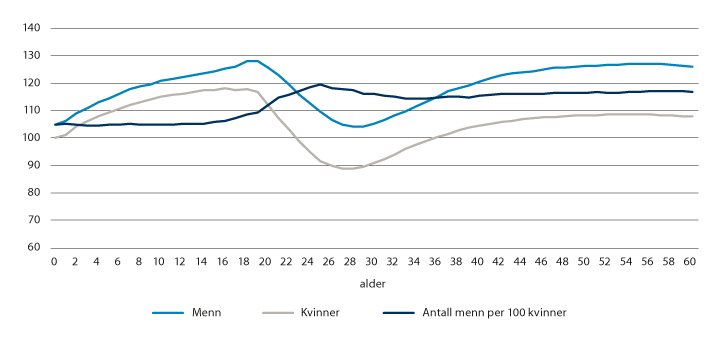 Menn har generelt høyere sysselsettingsandeler enn kvinner, noe som innebærer at mannsdominansen blir større enn når vi bare ser på befolkningen.