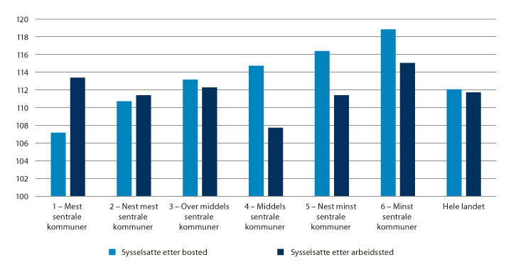 I SSBs sentralitetsindeks blir alle kommunene rangert etter befolkningens tilgang til arbeidsplasser og private og offentlige tjenester.1 Indeksen gir en oppdatert beskrivelse av bosettingsmønster og arbeidsplass- og tjenestekonsentrasjoner i Norge.2 SSB har inndelt kommunene i ulike sentralitetsnivåer, der de mest sentrale kommunene er blitt fordelt til sentralitet 1 og de minst sentrale til sentralitet 6.