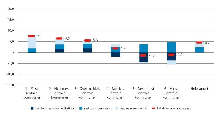 Nettoinnvandringen var sterk på alle sentralitetsnivåer. Fødselsoverskudd ga markant vekst i kommuner på sentralitet 1, men et fødselsunderskudd bidro til befolkningsnedgang på sentralitet 6. Det var netto innenlandsk flytting fra sentralitet 4–6 til sentralitet 1–3.