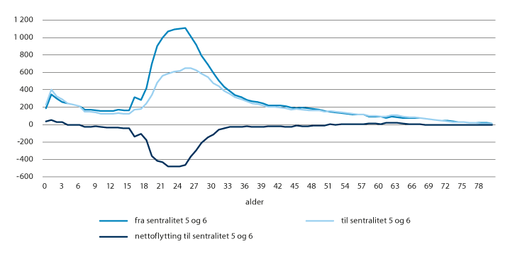 Figur 2.8 Antall innenlandske flyttinger til og fra sentralitet 5 og 6 fordelt etter alder (årlig gjennomsnitt i 2009–2018)1