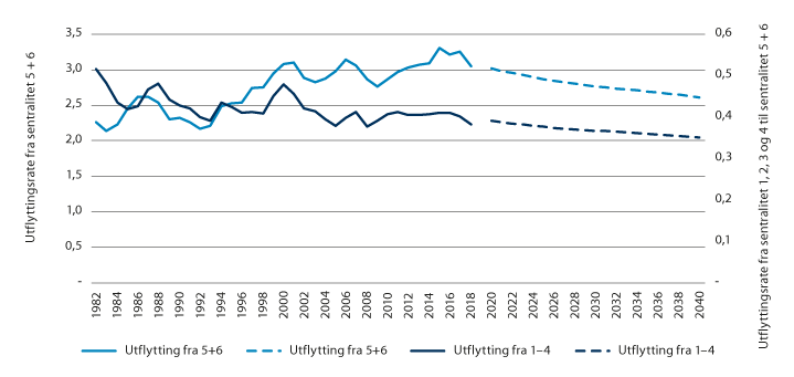 Figur 2.9 Rater for utflytting fra sentralitet 5 og 6 til sentralitet 1–4 og fra sentralitet 1–4 til sentralitet 5 og 6. Faktiske tall 1980–2018 og beregnede tall 2020–20401