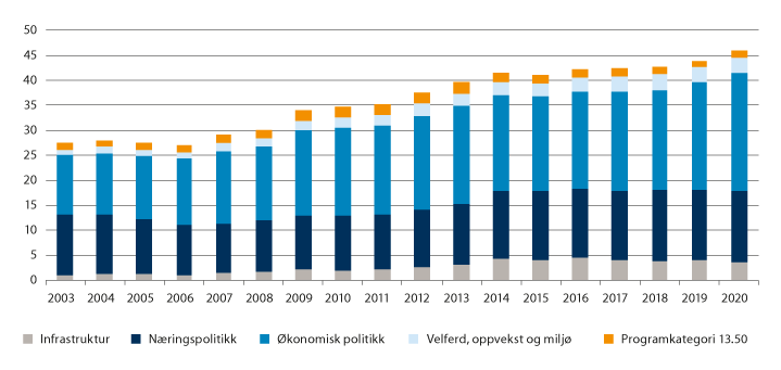 Figur 3.1 Innsats i distriktspolitikken 2003–2020. Tall i milliarder kroner1