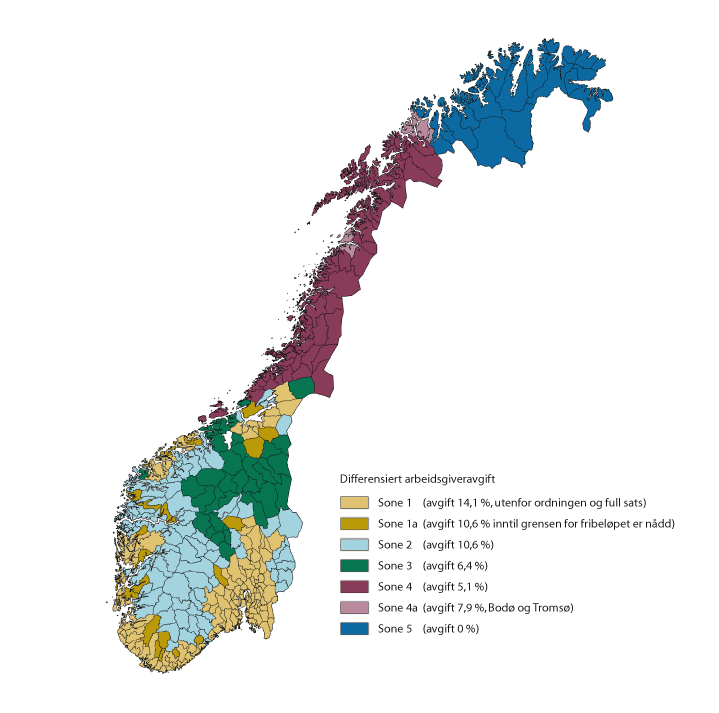 Arbeidsgiveravgiften betales av arbeidsgiver som en andel av arbeidstakers lønn. Differensiert arbeidsgiveravgift innebærer at satsene varierer ut fra hvor virksomheten er lokalisert. Satsene er lavere i distriktene enn i sentrale strøk. Landet er delt inn i sju ulike arbeidsgiveravgiftssoner (sone 1, 1a, 2, 3, 4, 4a og 5), jf. figur 3.2. Satsene varierer fra 14,1 prosent i sentrale strøk (sone 1) til 0 prosent i Finnmark og Nord-Troms (sone 5).