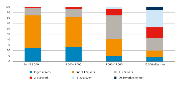 Figur 3.3 Antall årsverk til samfunnsplanlegging i kommunen, fordelt etter kommunestørrelse (2016). Andel kommuner i prosent