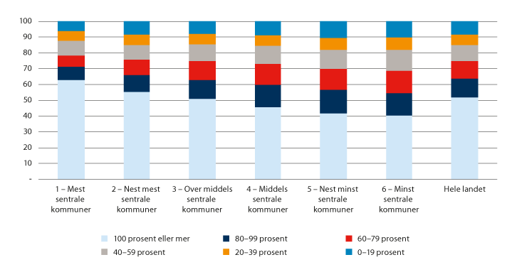 Samtidig varierer omfanget av omsorgstjenester betydelig mellom kommunene, også innenfor sentralitetsnivåene. Blant personer over 80 år varierte andelen brukere av hjemmetjenester i 2019, fra 16 til 65 prosent. Andelen av de over 80 år som mottar tjenester i institusjon, varierte mellom 2 og 34 prosent.21 Forskjellene kan blant annet reflektere ulik alderssammensetning og helse blant de over 80 år, ulike prioriteringer i kommunene og, som vi så over, ulike muligheter for bistand fra familie og naboer.