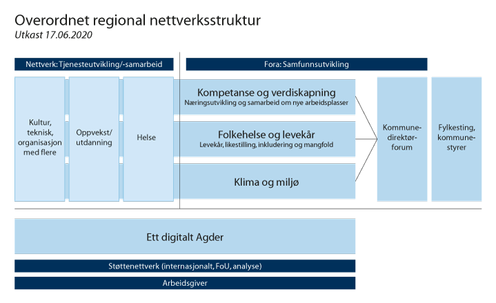 I forbindelse med utarbeidelse av regionplan Agder 2030 ble regionplan Agder 2020 og eksisterende samarbeidsstrukturer i regionen evaluert.1 Det gjaldt samarbeidsstrukturer mellom kommunene, og mellom kommunene og andre offentlige og private virksomheter i regionen.