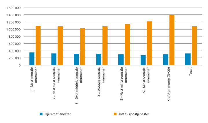 I distriktskommuner mottar altså en større andel av de eldre institusjonstjenester, og distriktskommunene ser også ut til å ha høyere ressursbruk per bruker enn mer sentrale kommuner. Dette kan ha sammenheng med at distriktskommuner har mindre enheter, kombinert med at høyere inntekter gir mulighet for høyere utgifter. Samtidig er utgiftene per bruker i hjemmetjenesten ikke høyere i distriktskommunene enn i mer sentrale kommuner. Dette er noe overraskende, i og med man ville forvente at lange avstander mellom brukerne i distriktene også skulle gi seg utslag i økt tidsbruk og dermed større lønnsutgifter per bruker. En mulig årsak er at distriktskommuner ser ut til å flytte mange av sine eldre til kommunale boliger når de ikke lenger klarer seg selv hjemme, jf. omtale i kapittel 7. Tallene i figuren er ikke korrigert for alder og omfang av tjeneste.