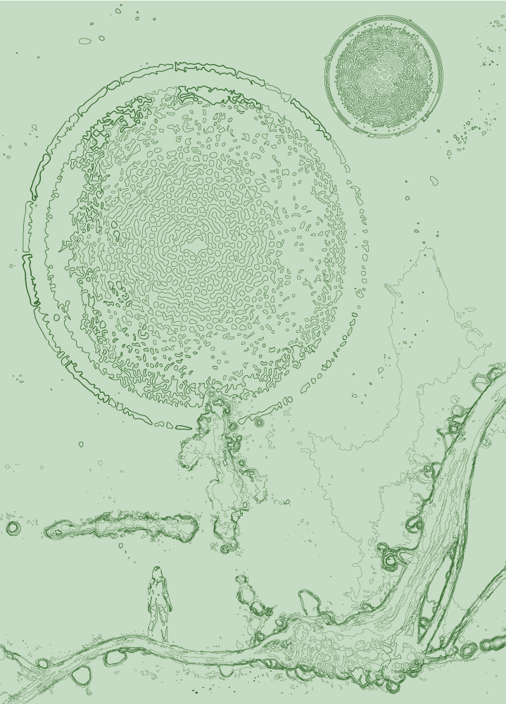 Som en sol og måne på himmelen står to kiselalger. Representanter for en annen av de viktige primærprodusentene i havet. Disse mikroskopiske organismene binder enorme mengder CO2. Dermed bidrar de til at ikke den globale oppvarmingen går enda raskere, og de er bunnplanken i havets næringskjeder. Verdens viktigste økosystemtjeneste.