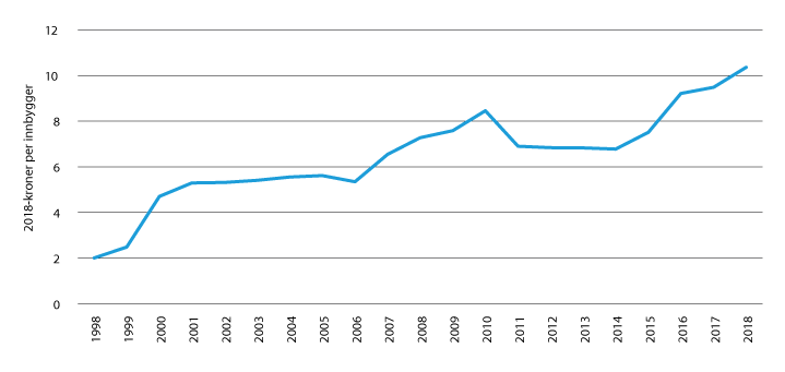 Figur 15.1 Tildeling til spesielle rettshjelpstiltak. Inflasjonsjusterte kostnader per innbygger (1998–2018).