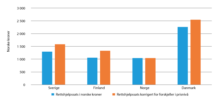 Rättshjälpslagen 23 §. Reglene om økonomiske vilkår for rettshjelp og systemet for egenandeler i Sverige er beskrevet i punkt 22.3.2.