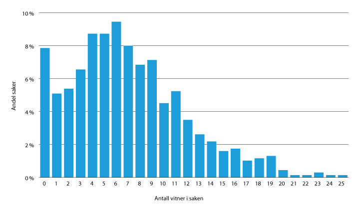 En gjennomsnittlig hovedforhandling i barnevernssaker for tingretten tar i overkant av 14 timer. Nesten halvparten av sakene har en sakkyndig registrert på saken. En gjennomsnittlig sak har drøyt sju vitner registrert i saken og bruker 90 advokattimer etter rettshjelpsordningen, fordelt på 1,7 mottakere.21 Nærmere 90 prosent av sakene med hovedforhandling ender med dom. Over 40 prosent av sakene kommer derimot aldri til hovedforhandling. 65 prosent av sakene som ender med dom, ender med medhold for kommunen, mot 17 prosent til den private part.