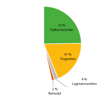 Antall saker | Andel av alle saker | Gjennomsnittlig lengde på forhandlingsmøte | Andel offentlig medhold | Andel med samtaleprosess i forkant | ||