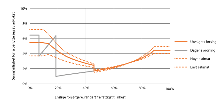 Antall foreldretvister, gitt de foreslåtte endringene i egenandel, blir estimert ved hjelp av den kalibrerte etterspørselsfunksjonen. En persons egenandel og beregningsgrunnlag gir ved hjelp av etterspørselsfunksjonen sannsynligheten for at personen går til sak i en foreldretvist.6 Samlet gir dette et estimat på hvor mange som vil gå til sak med den nye rettshjelpsordningen, samt hvilken egenandel de vil betale. Resultatet er en estimert økning i antall foreldretvister for retten på 30 prosent. Figur 31.1 viser den estimerte sannsynligheten for å benytte seg av advokat i foreldretvister for aleneforsørgere.