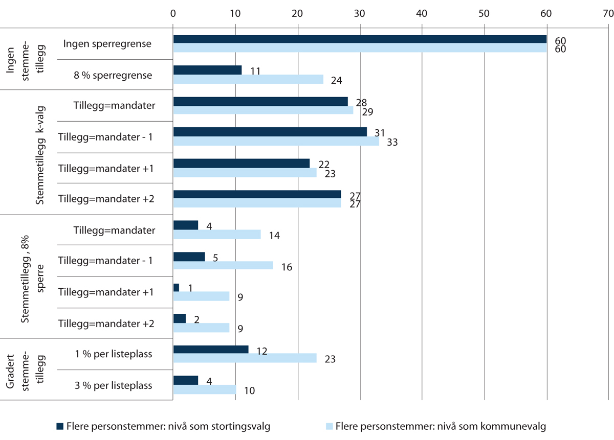 I Tabell 4.1 presenterer vi simuleringer som forutsetter at personstemmegivningen er på nivå med det den var ved stortingsvalget i 2013, altså at 12 prosent ga en personstemme. I tabellen varierer vi så nivået på sperregrensen (ingen sperregrense, 5 % og 8 %), og antall kandidater som partiene gir stemmetillegg (som beskrevet ovenfor).