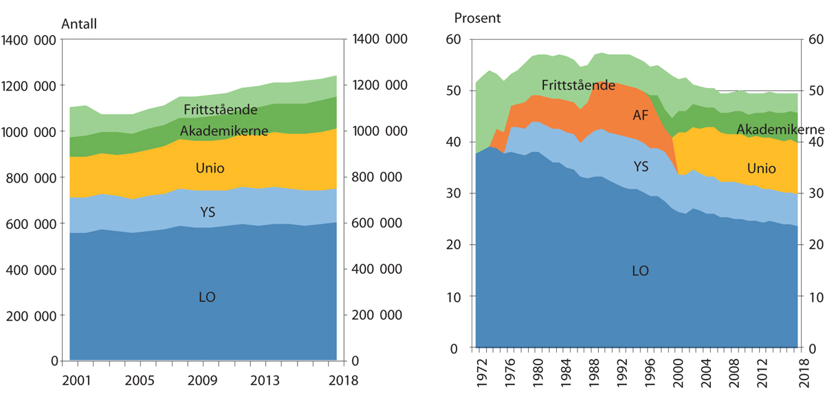 Det er noe usikkerhet om størrelsen på organisasjonsgraden. Tall fra Fafo viser en organisasjonsgrad på 49,3 prosent i 2018.2 Basert på tall fra SSB var andelen organiserte (yrkesaktive medlemmer) 50,3 prosent i 2018, men her er noen selvstendig næringsdrivende medlemmer inkludert. Fafo og SSB har samme antall yrkesaktive medlemmer for LO og YS, mens Fafo har lavere tall enn SSB for Unio og Akademikerne og høyere for frittstående organisasjoner. Forskjellen skyldes at Fafo i noen tilfeller har innhentet andre opplysninger enn det som organisasjonene har rapportert til SSB, at Fafo har korrigert for selvstendig næringsdrivende, og at SSB har hatt dobbelttelling av enkelte grupper i forbindelse med at forbund har skiftet tilknytning til hovedorganisasjon. Avvikene har sammenheng med at organisasjonene har ulike medlemsstrukturer og registrerte opplysninger.