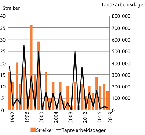 Figur 5.3 viser antall streiker og tapte arbeidsdager som følge av streik i perioden 1992–2019. Antall tapte dager varierer mye mellom år. I perioden 2000–2009 sto konfliktene i 2000 (bl.a. konflikt mellom LO og NHO der fullføring av den femte ferieuken var ett av elementene) for opp mot halvparten av de tapte arbeidsdagene. Videre på 2000-tallet var det relativt mange tapte dager og involverte arbeidstakere som følge av streiker i 2010 og 2012. Det var relativt omfattende streiker i kommunal sektor i 2010 og 2012, og i staten i 2012. Disse streikene involverte alle eller nesten alle organisasjonene. I 2010 var det også omfattende konflikter i byggevirksomheten. I 2016 ble det registrert 14 arbeidskonflikter med til sammen 165 800 tapte arbeidsdager, herav 92 700 i hotell- og restaurantvirksomhet. I 2017 var det 8 900 tapte arbeidsdager som følge av konflikt, hvorav 8 av 10 var innen helse- og sosialtjenester. I 2018 var det 24 200 tapte arbeidsdager, herav 12 000 i næringen informasjon og kommunikasjon og 7 200 i finansiering og forsikring. I 2019 gikk 21 532 arbeidsdager tapt i totalt åtte arbeidskonflikter, herav 18 900 innen samferdsel og helse- og sosialtjenester. Konflikter i oppgjørene er omtalt i vedlegg 1 i utvalgets rapporter.