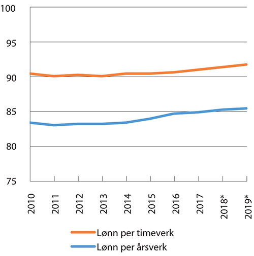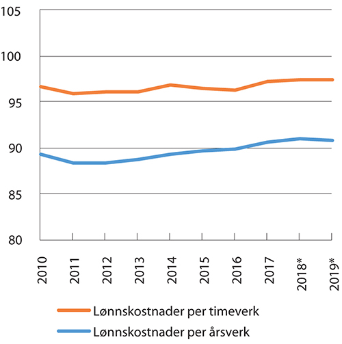 En tilsvarende sammenlikning av lønnskostnader per årsverk og per timeverk for offentlig forvaltning og industri er vist i figur 7.2. Over den tiårsperioden som figuren viser, har lønnskostnadene per årsverk i forvaltningen økt fra 89,2 prosent til 90,7 prosent av lønnskostnadene i industrien. Også lønnskostnader per timeverk har økt i offentlig forvaltning sammenliknet med industrien, og utgjorde 97,4 prosent av lønnskostnader per timeverk i industrien i 2019. De relative størrelsene i figur 7.1 og 7.2 er nedjustert med fem til ti prosentpoeng sammenliknet med fjorårets rapport, som følge av endringene i nasjonalregnskapet beskrevet over.