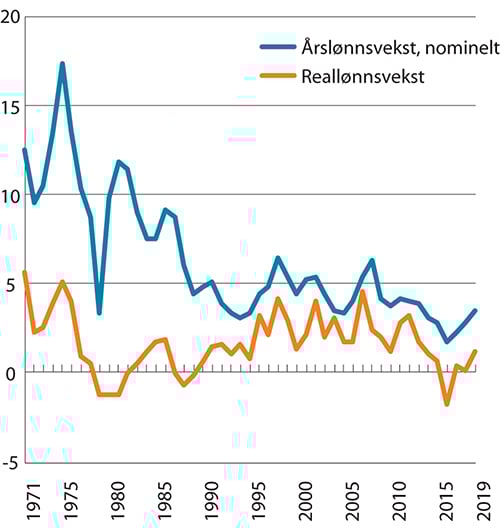 I denne boksen presenteres utviklingen i nominell lønn (årslønn i nasjonalregnskapet, se vedlegg 2) og reallønn1 siden 1970. Den nominelle lønnsveksten var høy på midten av 1970-tallet, med over 17 prosent i 1975. Dette ga en reallønnsvekst på over 5 prosent. Reallønnsveksten var også over 5 prosent i 1971. Til tross for sterk prisvekst på 1970-tallet var veksten i reallønn samlet for dette tiåret forholdsvis sterk. Lavere lønnsvekst i 1979 skyldtes i stor grad innføring av lønns- og prisstopp. På 1980-tallet varierte lønnsveksten mellom 12,0 prosent i 1981 og 4,4 prosent i 1989. Lønnsveksten i 1988 og 1989 var påvirket av inntektsreguleringslover.2 Reallønnsveksten på 1980-tallet sett under ett var lav, og negativ i flere år. Siden begynnelsen av 1990-tallet har både lønns- og prisveksten stort sett vært klart lavere enn på 1970- og 80-tallet, men reallønnsveksten har vært høy. I 2011 og 2012 bidro lav prisvekst til høy reallønnsvekst, men med høyere prisvekst og lavere nominell lønnsvekst falt reallønnsveksten i årene etter. Lavere gjennomsnittlig nominell lønnsvekst og forholdsvis høy prisvekst førte til et fall i reallønnen på 1,8 prosent i 2016. I 2017 og 2018 tok årslønnsveksten seg opp. Dette ga reallønnsvekst i 2017, mens prisstigningen nesten utliknet veksten i nominell årslønn i 2018. I 2019 økte reallønnen med 1,2 prosent.