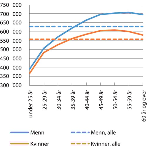Figur 2.2 viser heltidsansatte kvinners lønn som andel av menns i gjennomsnitt etter alder, se også tabell 4.15 i vedlegg 4. Lønnsforskjellen mellom kvinner og menn er større enn gjennomsnittet for de over 40 år. Fra 2018 til 2019 ble lønnsforskjellene redusert for alle aldersgrupper. Figur 2.3 viser gjennomsnittslønn for kvinner og menn etter alder i 2019. Dette er et tverrsnitt over alle fødselskohorter, og det kan ikke uten nærmere analyse slås fast om bildet av økende forskjeller med økende alder speiler mindre forskjeller i yngre generasjoner eller at forskjeller øker gjennom kvinners og menns yrkesløp.