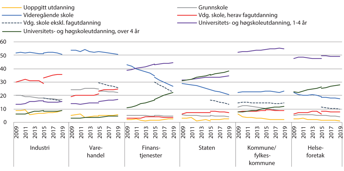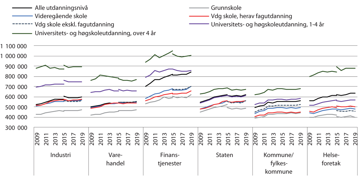 Det er minst lønnsforskjell for de som har grunnskoleutdanning. Størst lønnsforskjell er det for ansatte med universitets- eller høgskoleutdanning til og med 4 år, men dette varierer mellom næringene, se vedleggstabell 4.13. For utviklingen i lønnsforskjeller mellom kvinner og menn fordelt etter utdanningslengde og hvor deltid er inkludert, vises det til tabell 4.14 i vedlegg 4.