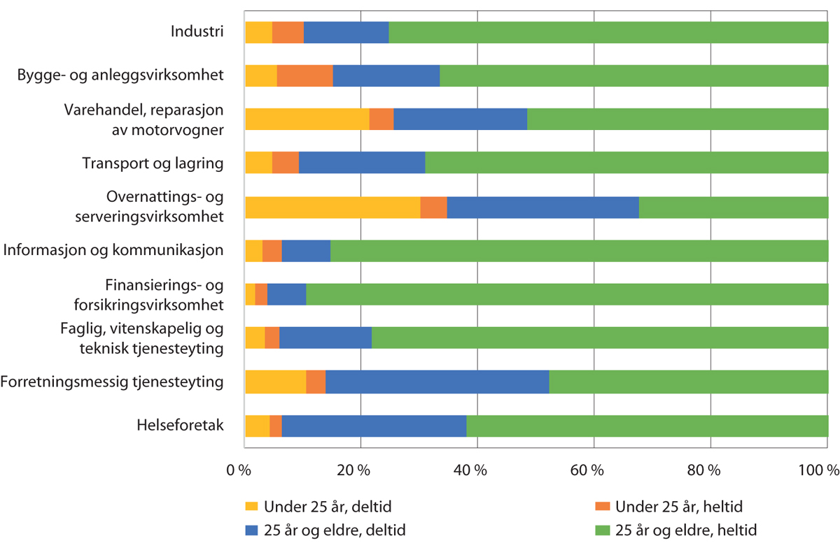 Kvinner står for 4 av 10 arbeidsforhold med heltid. Deltidsarbeid er langt mer utbredt blant kvinner enn blant menn, og kvinner står for nær halvdelen av heltids- og deltidsarbeidsforhold under ett.