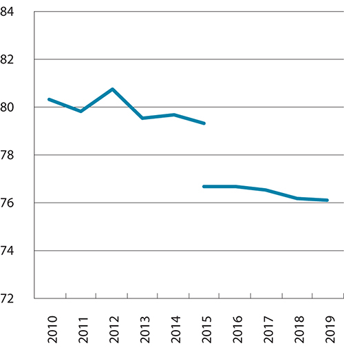 Universitet eller høgskole, t.o.m. 4 år | 79,8 | 79,6 | 80,5 | 80,0 | 80,4 | 79,4 | 78,4 | 79,0 | 79,3 | 79,5 | 80,0 | 719 400 | 575 280 | 55 | 56 |