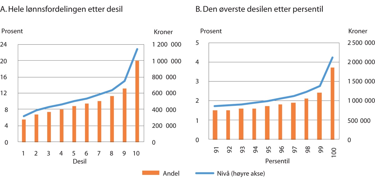 Tabell 2.13 viser fordelingen av lønn blant ansatte i privat sektor og i offentlig forvaltning. Gjennomsnittlig er lønnsnivået for de lavest lønte høyere i det offentlige enn i privat sektor, og de høyest lønte har høyest lønnsnivå i privat sektor. I offentlig forvaltning mottok i 2019 desil 1 6,1 prosent av samlet lønnssum, mens desil 10 mottok 16,5 prosent. I privat sektor mottok desil 1 5,2 prosent av samlet lønnssum, mens desil 10 mottok 21,2 prosent. At lønnsspredningen er større i privat sektor enn i offentlig forvaltning ses også ved at Gini-koeffisienten er 0,229 i privat sektor og 0,149 i offentlig forvaltning. Virkningen av å holde lærlinger utenfor materialet er om lag den samme for offentlig forvaltning og privat sektor.