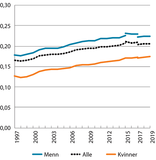 Gini-koeffisienten er et summarisk mål på inntektsulikhet og antar verdier mellom 0 og 1. Verdien 0 tilsier at inntektene er helt likt fordelt, mens en Gini-koeffisient lik 1 tilsier at en person mottar all inntekt. Gini-koeffisienten var 0,206 i 2019, og figur 2.9 viser utviklingen over tid. Lønnsspredningen for kvinner og menn under ett har gjennomgående økt på 2000-tallet til 2015. Etter 2015 er Gini om lag uendret samlet og for menn, mens den har økt for kvinner, også det siste året.