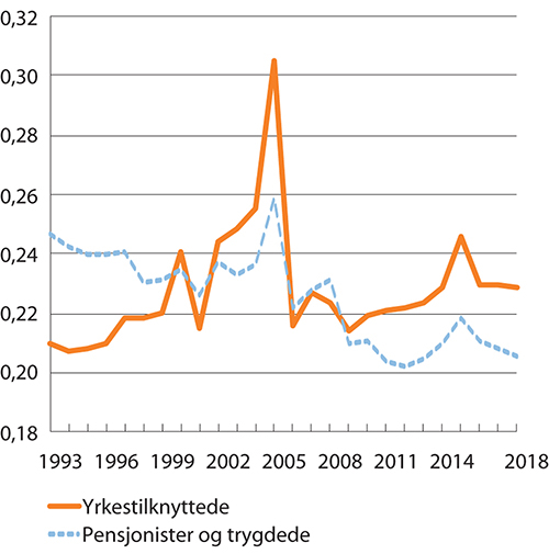 Figur 7.2 Utviklingen i fordelingen av inntekt etter skatt for yrkestilknyttede1 og pensjonister/trygdede2 i perioden fra 1993 til 2018. Målt ved Gini-koeffisienten per person